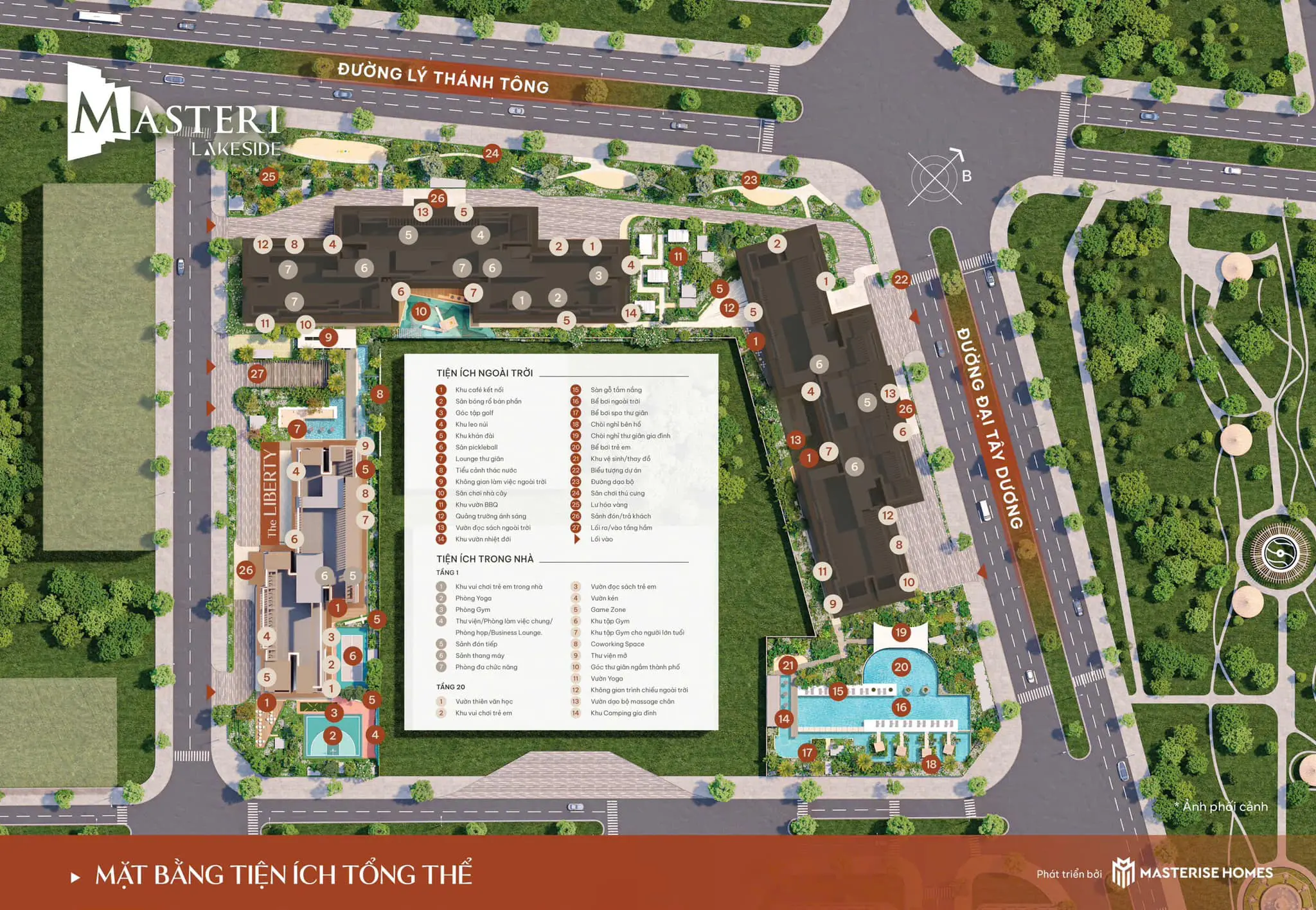 Masteri Lakeside được xây dựng trên lô đất rộng 1,79ha có quy mô 3 toà căn hộ cao 34-38 tầng bao gồm 1 toà 34 tầng, 2 toà 38 tầng trong đó toà L1 (z34) sẽ ra mắt đầu tiên với tên gọi là The Liberty cao 34 tầng, thiết kế theo layout hình chữ Z hiện đại, giúp khai thác tối đa ánh sáng và gió tự nhiên, hệ cửa kính Low-E cao cấp cách âm, cách nhiệt.