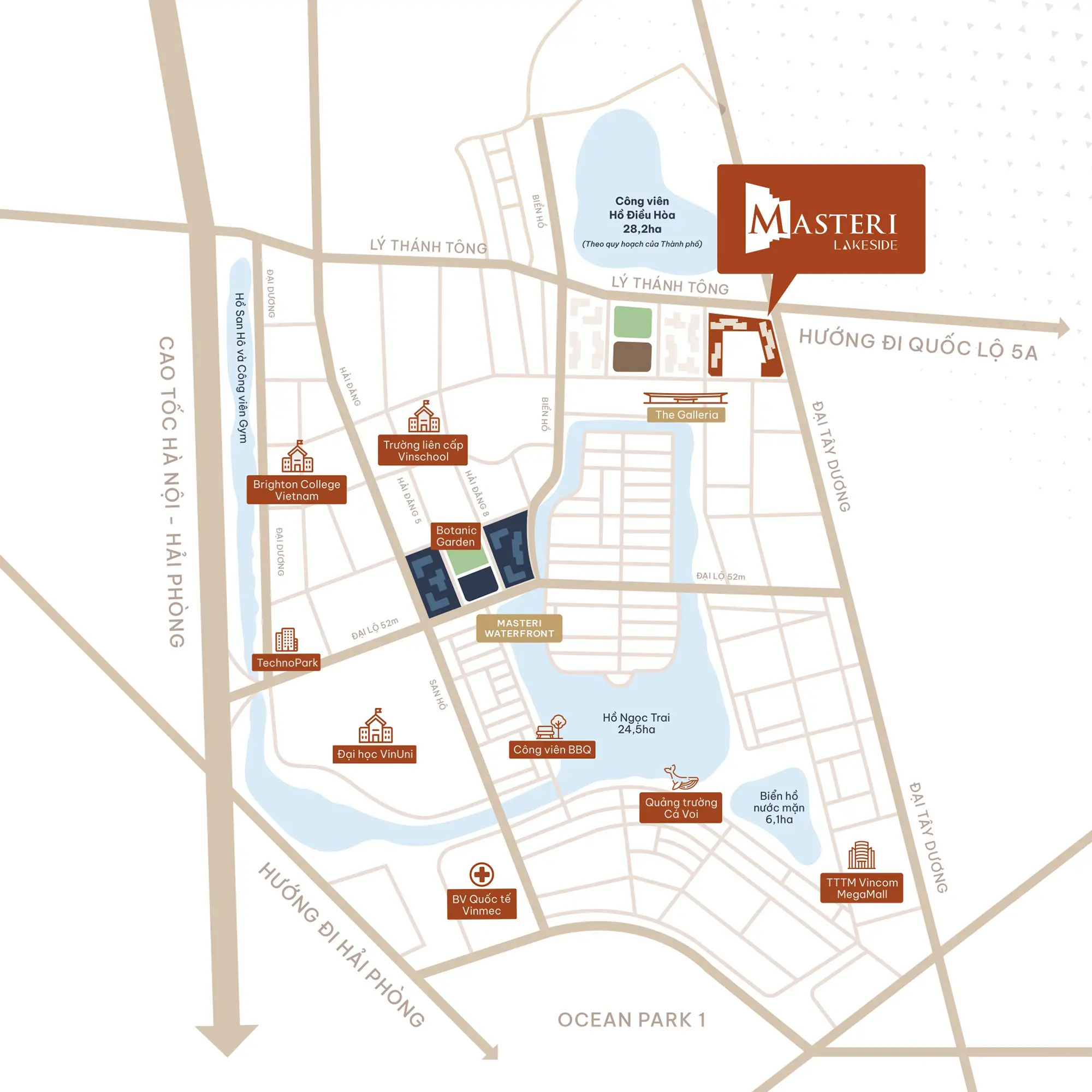 Dự án Masteri Lakeside sở hữu vị trí đắc địa tại giao lô của đường Lý Thánh Tông và Đại Tây Dương trong khu đô thị Vin Ocean Park 1, Gia Lâm, Hà Nội với khả năng kết nối linh hoạt tới mọi khu vực tiện ích nội khu cũng như các tỉnh thành phố lân cận nhờ 3 trục đường Thành Trung, quốc lộ 5A, cao tốc 5B Hà Nội – Hải Phòng.