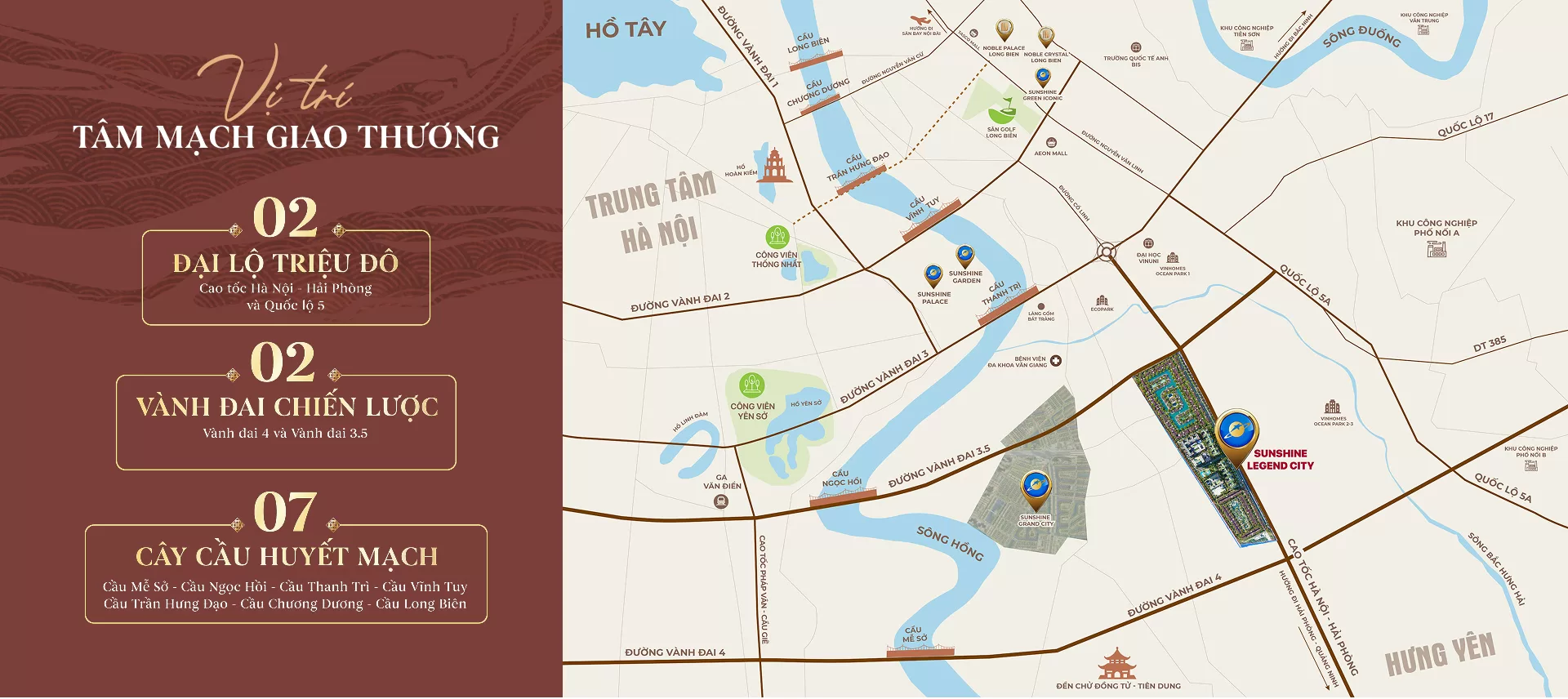 Sunshine Legend City sở hữu vị trí đắc địa tại trung tâm huyện Văn Giang, tỉnh Hưng Yên, nơi có hệ thống giao thông đồng bộ và kết nối thuận tiện. Dự án nằm giữa vành đai 3,5 và vành đai 4, gần các khu đô thị lớn như Vinhomes Ocean Park 2, Ocean Park 3 và Ecopark, đồng thời tiếp giáp với đường cao tốc Hà Nội – Hải Phòng. Nhờ vậy, cư dân sinh sống tại Legend City có thể dễ dàng di chuyển đến trung tâm Hà Nội và như các tỉnh lân cận mà không mất quá nhiều thời gian.